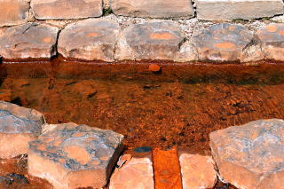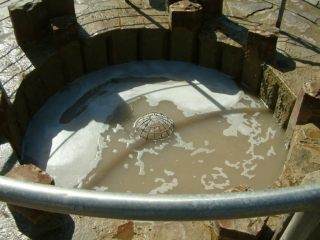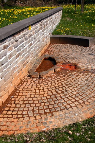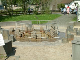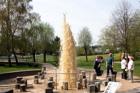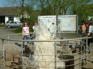| Wallenbornヴァレンボルン村にはアイフェルで最も有名な非火山性冷鉱泉が有ります。この村の地下25~30mのところに二酸化炭素ガスが溜まっている巨大な空洞が有ります。 地球深部から上昇してきたマグマ溜まりにこのガスが熱せられて膨張し、地下38mを通る地下水を35分おきに爆発を起こすように地上へ押し上げます。 その高さは4m以上にもなります。 右は一年後に撮影した写真です。水の色が茶色になっているようでした。 |