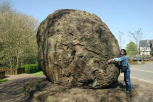 展望台からはこの一帯が一望出来ます。 | シュトローン村に有る120トンの溶岩弾。近くのヴァルトゲスベルグ山採掘場で発見された。噴火で飛ばされたが重量が大きかった為に火山の外まで飛ばず、火口内を転がるうちに更に巨大化したと推測されています。表面を解けた玄武岩が上から下へと流れて層になった模様が有るのが特徴です。 公式サイトへ ![]() |