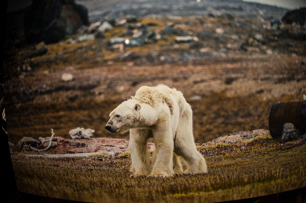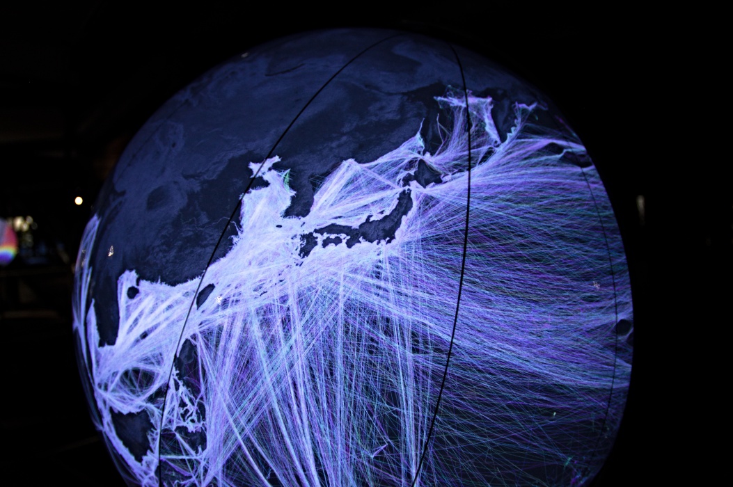 今回のテーマは壊れやすい楽園です。 大きな球形の風船を天井から吊るす展示会は2016年にも有りました。 今回は日の満ち欠けだけでは無く、空路や航路等の人間の活動も再現した投影でした。 地上階のギャラリーには動物の写真、一階には破壊された自然の写真が展示されていました。
