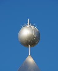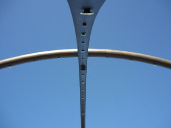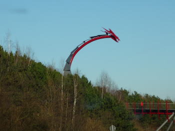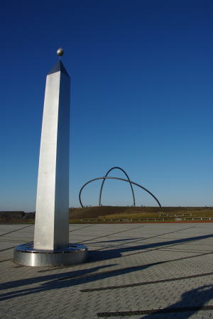 地平線を利用した天文台と言えば英国のストーンヘンジが有名ですが、この天文台はその現代版です。 ホーヘヴァルド丘はレックリングハウゼン第二炭坑のいわゆるゴミ捨て場として形成された人工の丘です。廃坑になってからは整備され、公園として開放されていました。 2007年11月から1年掛けて建設され、2008年11月8日に一般公開されました。 しかし、2008年冬の大寒波の為に一部の溶接部分が破断し、2009年1月から修理中。再公開のメドは立っていません。 以下の写真は12月末に訪れた際に撮影したものです。この日も大変寒い日でした。 天文台は43mと45mの二つの半円の鉄骨を組み合わせた天球と、オベリスクを針にした太陽時計です。 何が何の意味をしてるのか説明の掲示板が立っているのですが、余りにも寒くって、まともに読む気にもなりませんでした。 再公開されたら、又暖かい時にゆっくり見てみたいと思います。 |